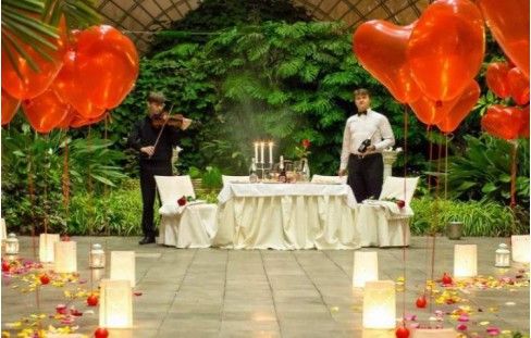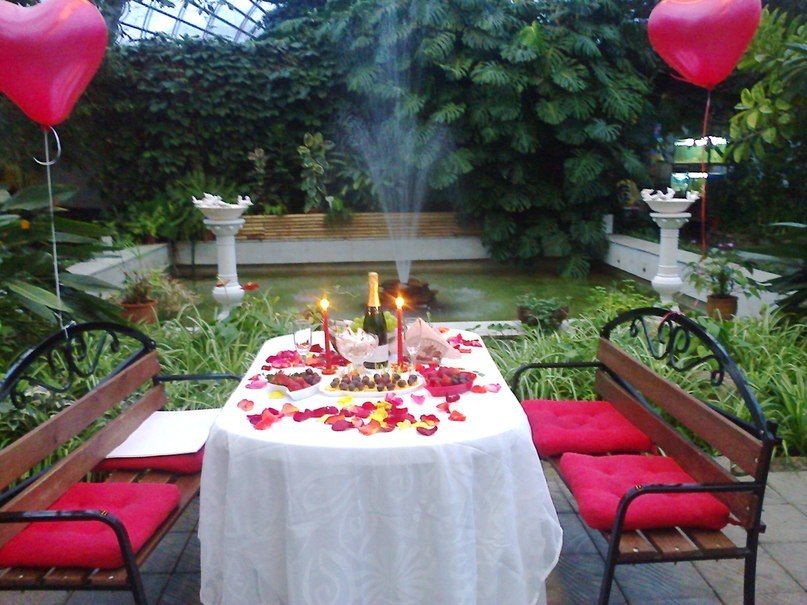 В уютном кафе или в оранжерее накрыт столик, только на двоих, свечи, шампанское, цветы и лепестки роз! Тропическая атмосфера дополняется журчанием фонтана и игрой саксофониста (или скрипача)! Лето уже пришло к Вам и не надо его ждать)