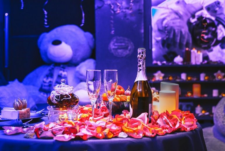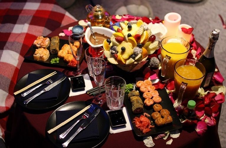 На столе шампанское, фрукты, сладости и тд. Предварительно мы можем Вам помочь снять видео-предложение или признание в любви, которое Ваша вторая половинка увидит на большом экране! И конечно же фильм на Ваш выбор и только для Вас!